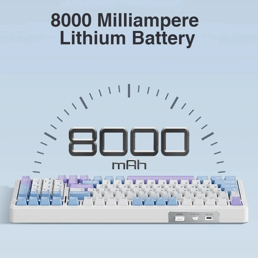 F99 supports USB wired, 2.4G wireless and Bluetooth 5.0 connection,a convenient and versatile option for users who use multiple devices and want a keyboard that can easily switch between different modes.It‘s compatible with Laptop, iPad, IOS, Windows, Mac or Android. No fussy connection process!An indicator light on the right side of the keyboard shows the state of the battery.